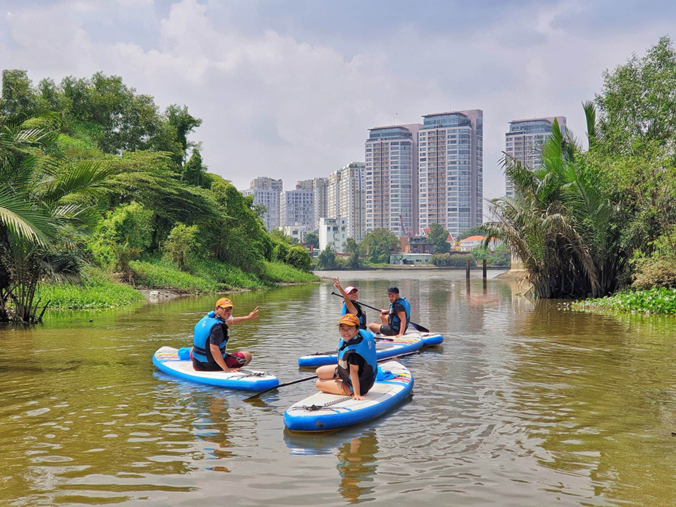 Paddleboarding has become increasingly popular among young people, with key spots in Phu My Hung, District 7, and Binh Quoi, Binh Thanh District, attracting many interests. In Phu My Hung, you can enjoy views of the lush greenery lining the riverbanks, while Binh Quoi offers a striking view of the Landmark 81 building.