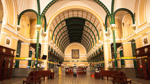A testament to the rich history and stunning architecture of Ho Chi Minh City, Vietnam, is the Saigon Central Post Office, located in District 1. It is constructed during the era of French colonization in the late 1800s, this site has gained worldwide recognition as a renowned tourist destination, attracting admirers with its enduring allure and opulence. With its elaborate tile patterns, rich ironwork, and tall ceilings covered with delicate motifs, the graceful building, built by Gustave Eiffel, radiates a feeling of grandiosity and refinement. Visitors are taken back in time to a time when communication was a treasured rite by the large interior space, which is broken up by arched windows and the central dome with its detailed mosaic map showing the telegraph lines between Vietnam and Cambodia. Additionally, the post office is revered as a cultural landmark, symbolizing resilience and national pride. You can enjoy the enchanting experience of strolling through the corridors and admiring the architectural details.