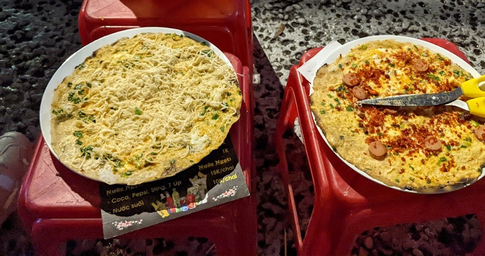 The aroma of grilled egg cakes wafts through the streets of Saigon. Ingredients such as corn, meat, sausage, cheese, chicken, onions, shrimp, etc. are spread evenly on rice paper. With the skill of the seller, the grilled rice paper is hot with a golden, crispy outer layer.
