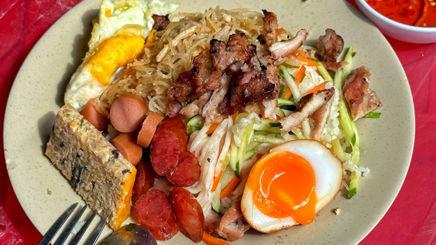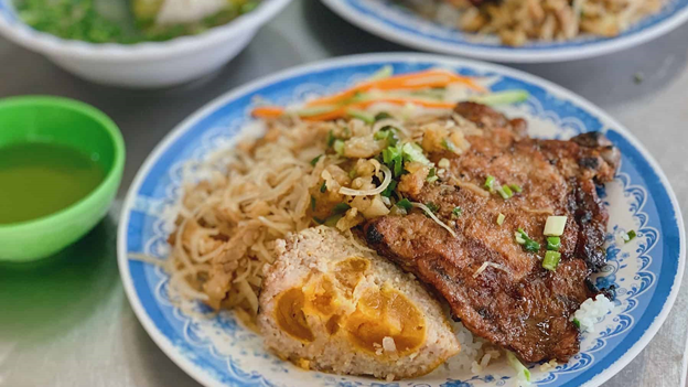 Com Tam Ba Nam, which is located in District 1, has been a culinary institution for over 50 years, drawing patrons daily with its variety of broken rice dishes. This modest eatery, adorned with simple plastic tables and chairs. The broken rice, with its distinct texture, succulent ribs, crispy fried eggs, savory pork skin, delicate spring rolls, flavorful sausages, and tender soft-boiled eggs. Complemented by a medley of pickled vegetables and shredded cucumbers, each dish is elevated to perfection with a drizzle of their signature sweet and sour fish sauce. You must try Ba Nam’s soft-boiled eggs, which stand out as a must-try delicacy, and are the best seller. Delightfully chewy and indulgently fatty on the inside, these eggs pair harmoniously with the accompanying dipping sauce, adding a rich depth to every bite.