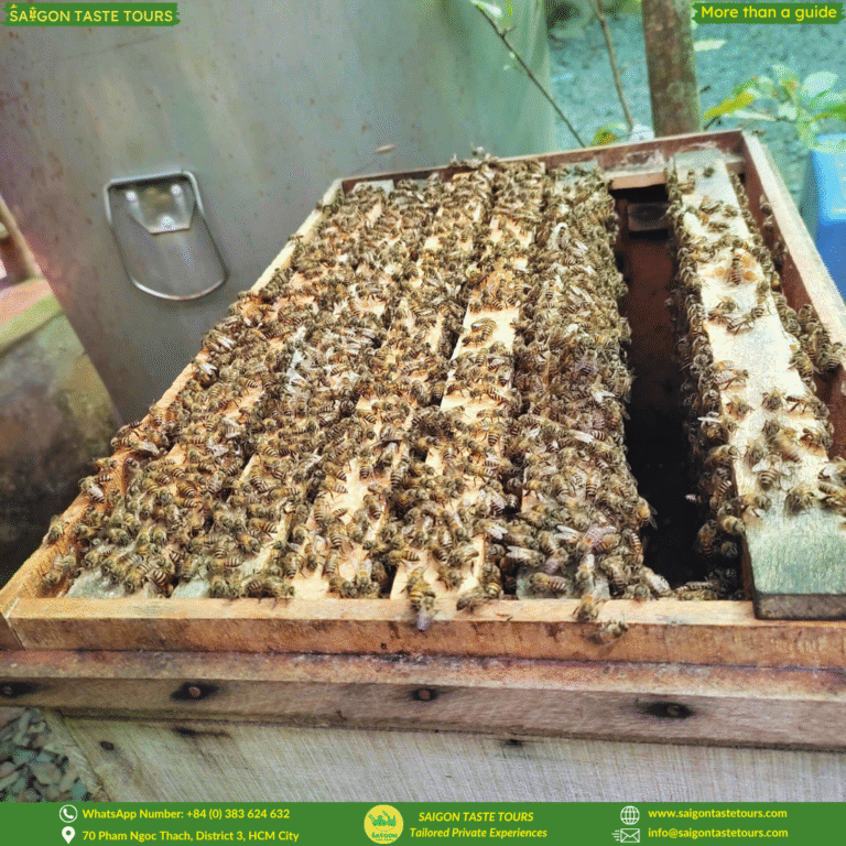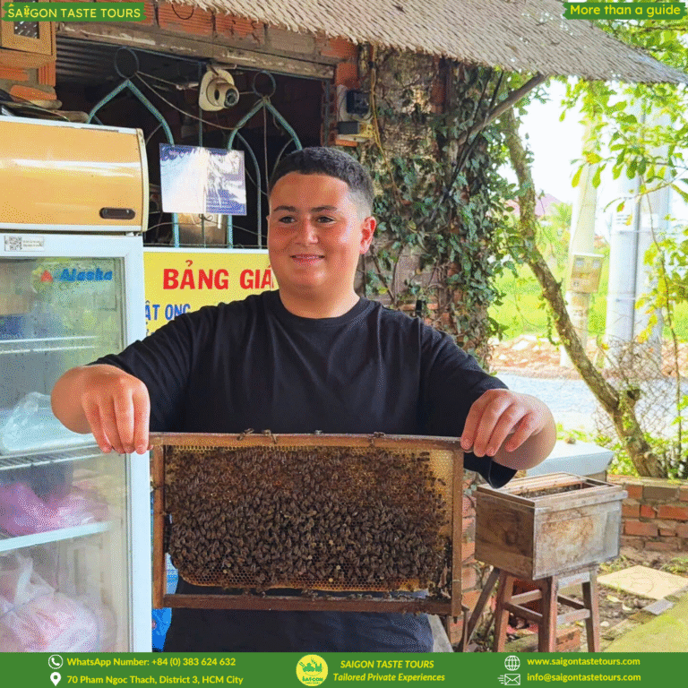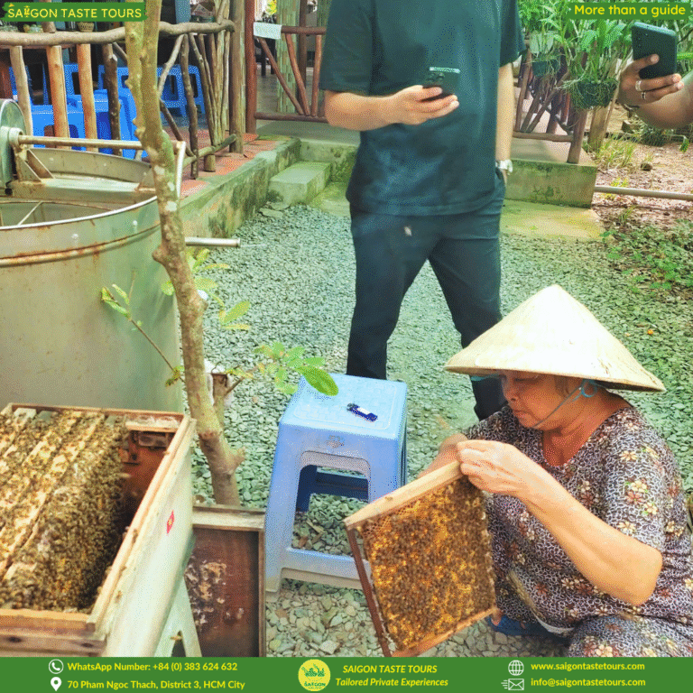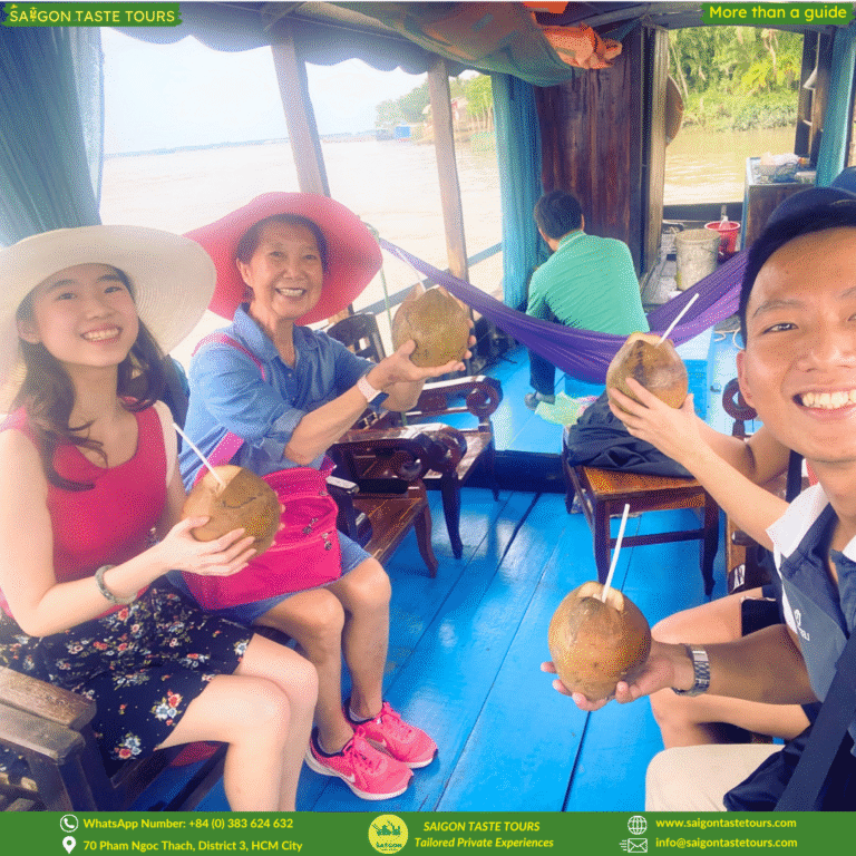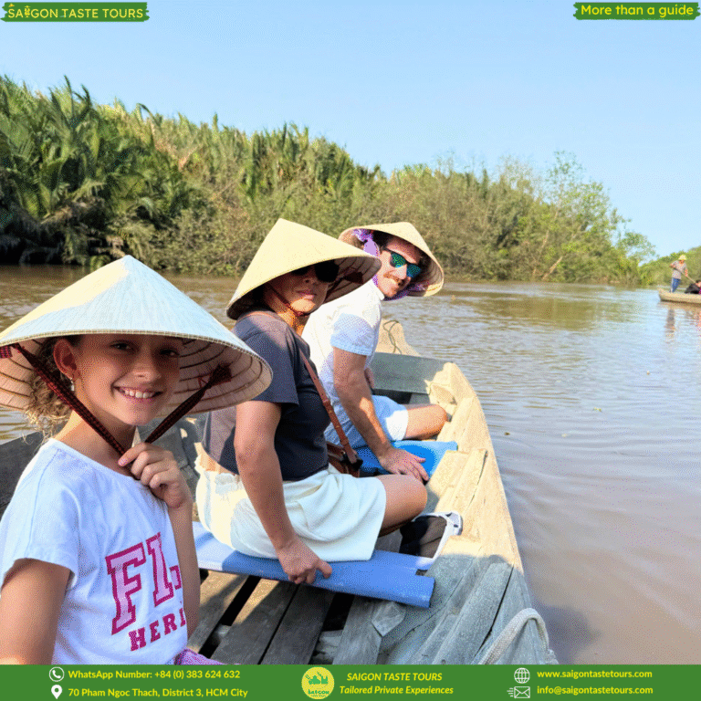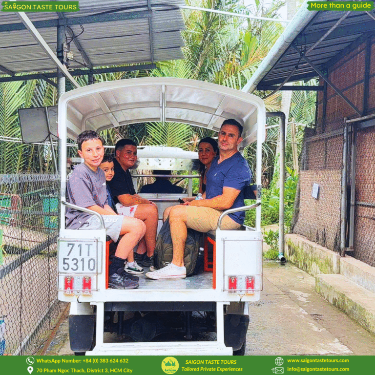 At Saigon Taste Tours, we keep our tours intimate with a maximum of 10 guests, ensuring a more personal and authentic experience. Escape the hustle of Saigon and discover the peaceful charm of the Mekong Delta, just a 2-hour drive away. Relax as you’re picked up from your hotel and taken on a journey through My Tho City, famous for its coconut groves, quiet waterways, and authentic countryside life. Enjoy a peaceful rowing boat ride through quiet coconut canals, take in scenic river views, and sample local honey, tropical fruits, and coconut candy.