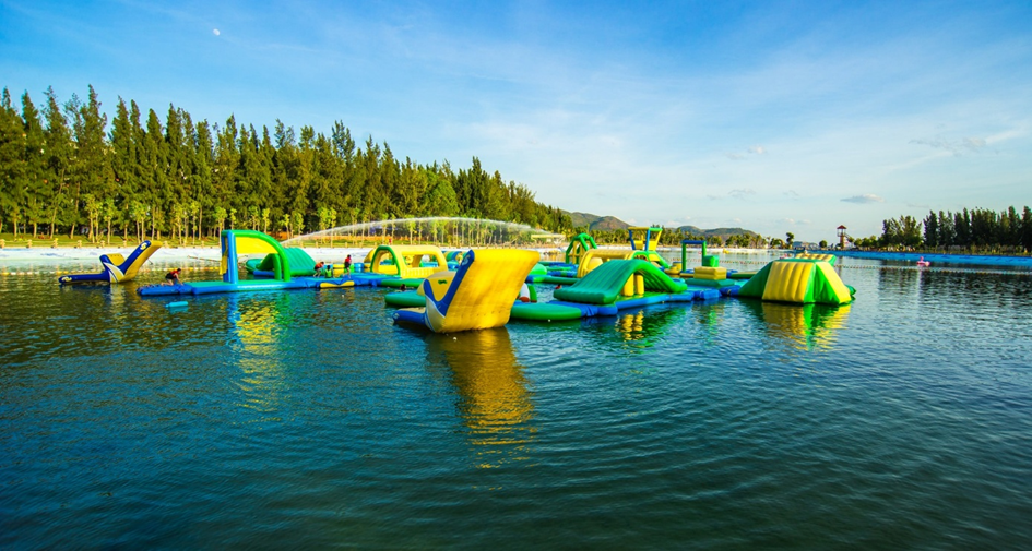 Cua Bien Tourist Area, this amusement park spans a vast area on both land and water, offering an array of outdoor activities such as ziplining, artificial rock climbing, archery, cycling, kayaking, and a floating water park. Visitors can enjoy unlimited access to all games with a full-day ticket priced at 300.000 VND for adults (12 USD) and 200.000 VND for children (8 USD). Alternatively, individual game tickets are available for 50.000 VND each (2 USD).